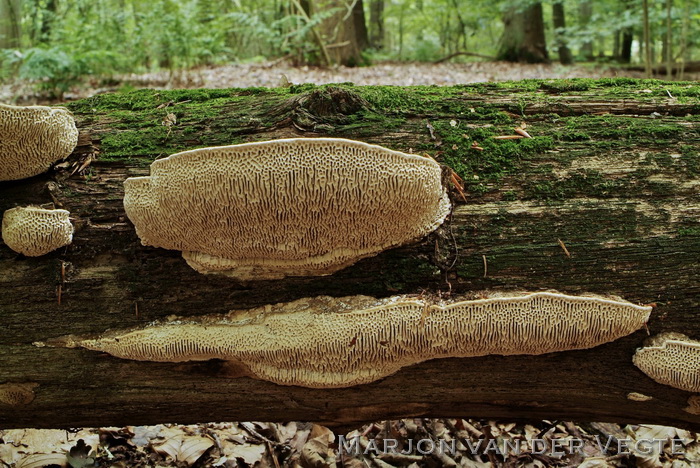 Op dikke stammen en stronken van loofbomen, vrijwel alleen van Eik, ook op constructiehout.