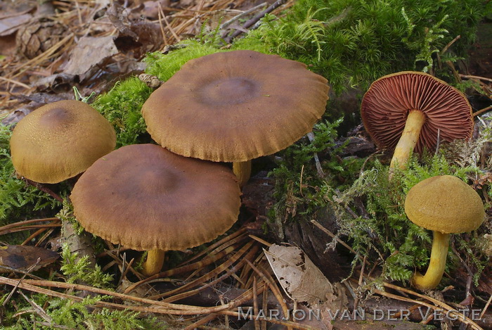 In naaldbossen, onder Fijnspar en Den, vaak onder jonge bomen, op voedselrijke zandgrond.