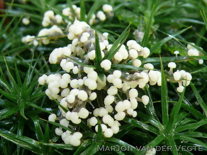 Aan onderkant van natte stronken, liggende (bemoste) stammen en takken van loofbomen, soms op bladeren en kruidachtige stengels.